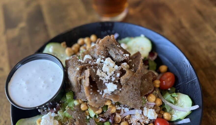 Mixed greens, choice of gyro meat or falafel, farro, bell peppers, kalamata olives, tomatoes, crispy chickpeas, red onion, cucumbers, feta cheese, tahini ranch on the side