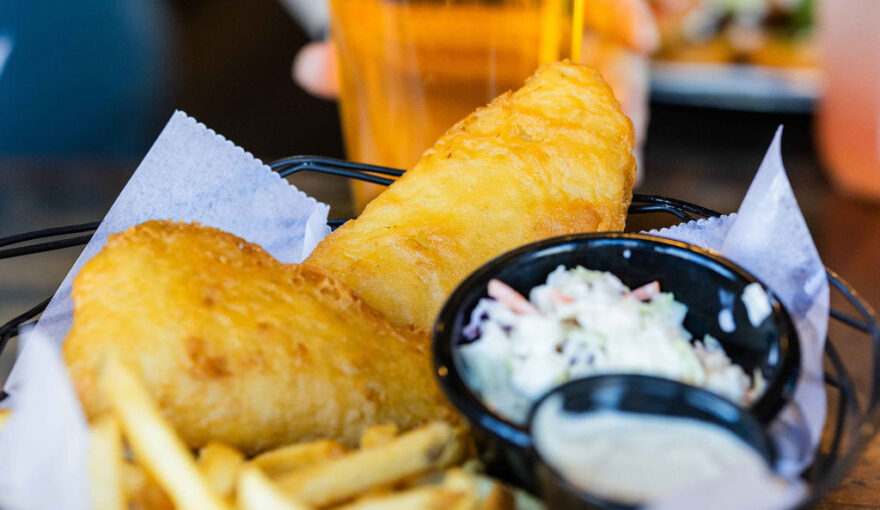 Crispy beer-battered cod, tartar sauce, French fries and coleslaw