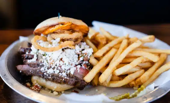 Sliced medium rare tri-tip steak, pico de gallo, avocado, crispy onions,