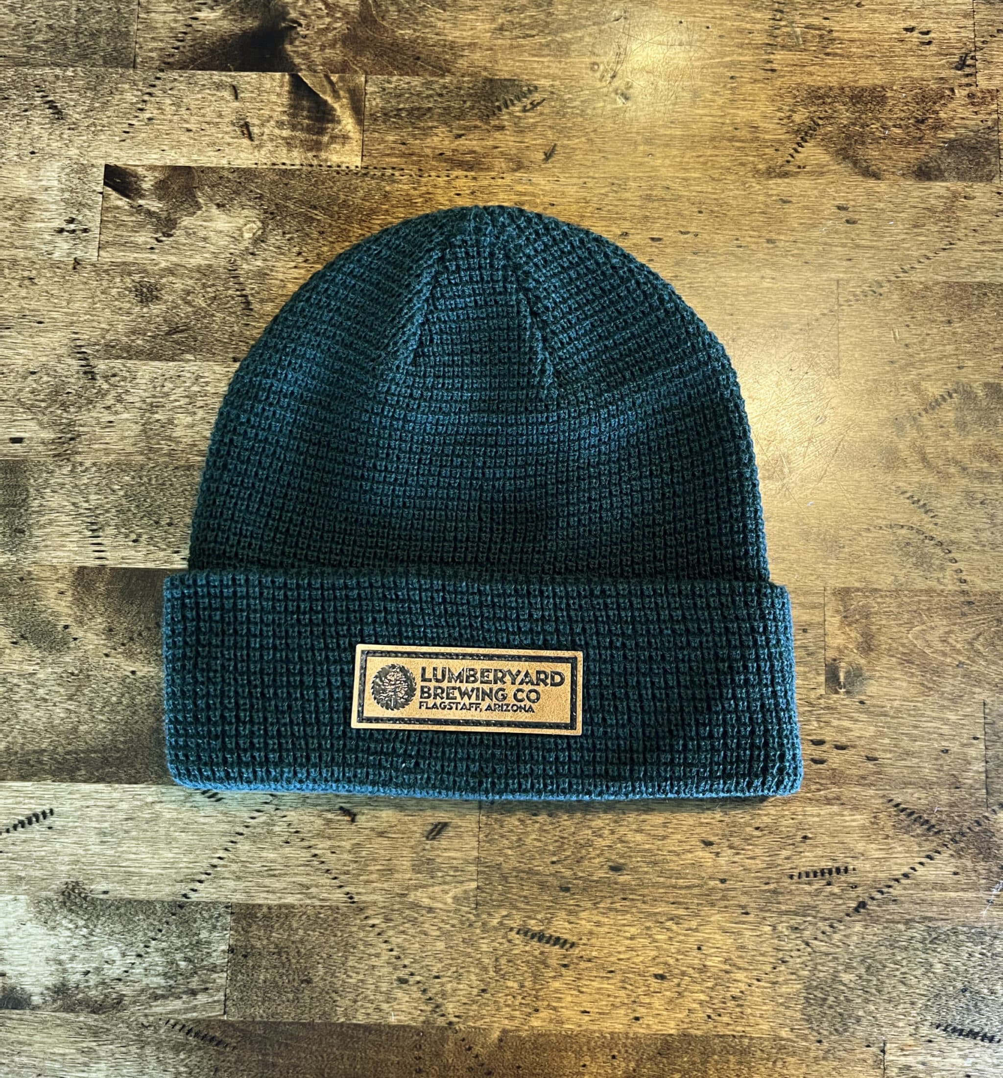 This knit hat is a red or forest green color with a suede Lumberyard Brewing Company patch. Limited quantities available!